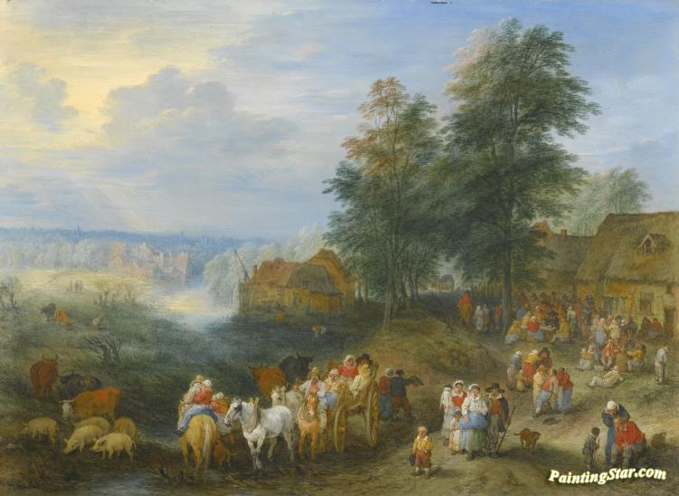 Travellers And Their Herds Departing From A Village, Art Painting by Théobald Michau