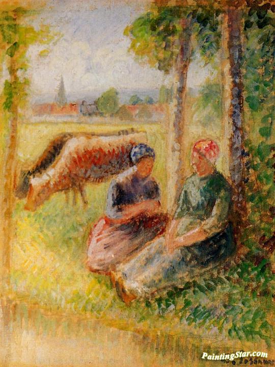 Two Cowherds by the River, Art Painting by Camille Pissarro