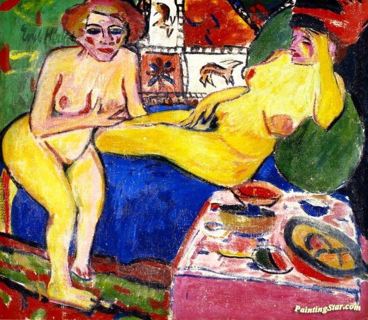 Two Female Nudes On A Blue Sofa, Art Painting by Erich Heckel