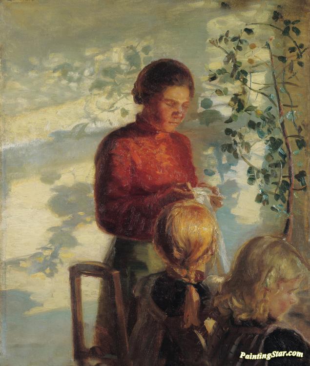 Two little girls being taught how to sew, Art Painting by Anna Ancher