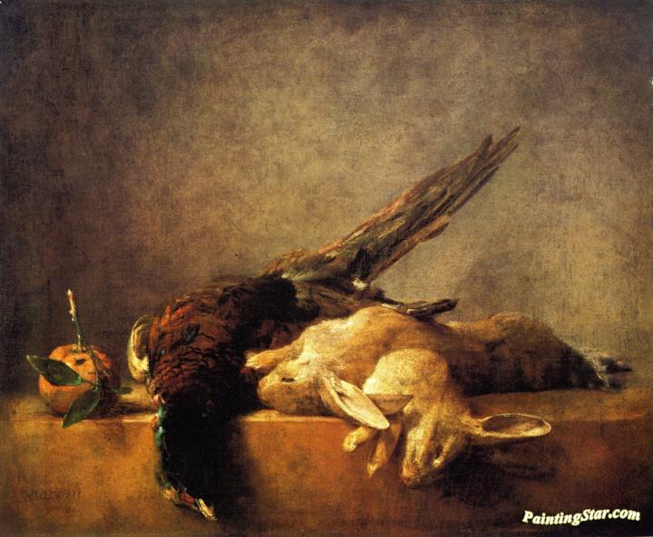 Two Rabbits, a Pheasant and a Seville Orange on a Stone Ledge, Art Painting by Jean-Baptiste-Simeon Chardin
