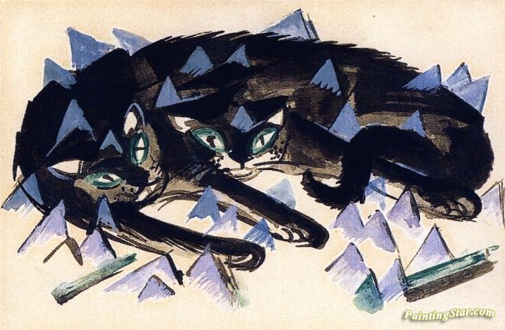 Two Reclining Black Cats, Art Painting by Franz Marc