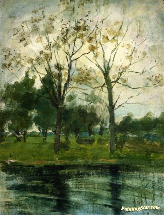 Two Trees Silhouetted behind a Water Course, Art Painting by Piet Mondrian