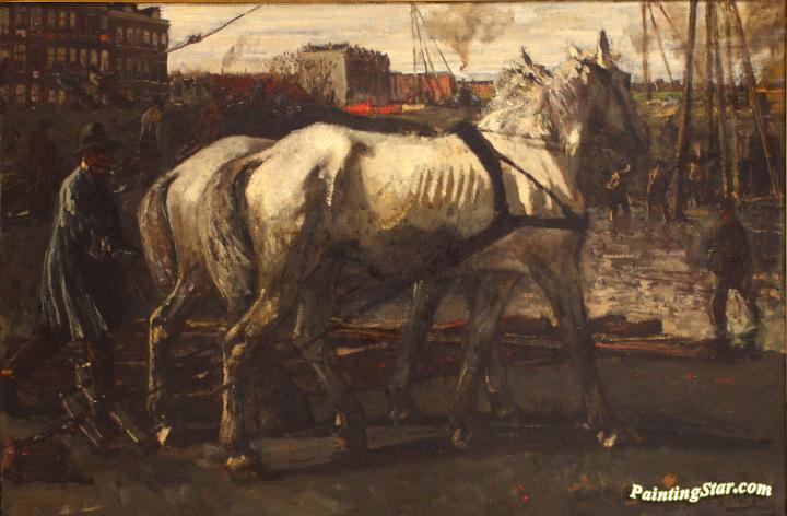 Two White Horses Pulling Posts in Amsterdam, Art Painting by George Heidrik Breitner