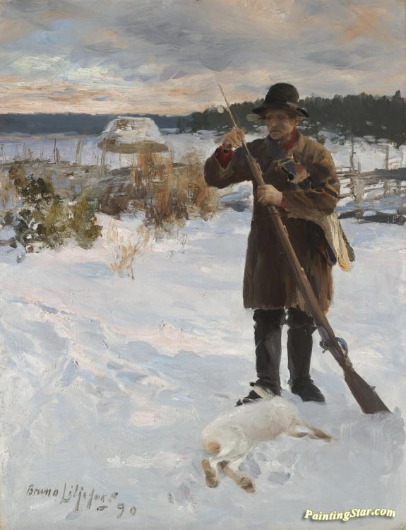 VÄrdshusarn, Peasant Hunter In Winter Landscape, Art Painting by Bruno Liljefors