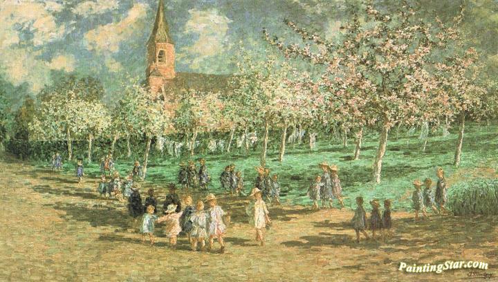 Verger En Fleur Et écoliers, Art Painting by Jenny Montigny