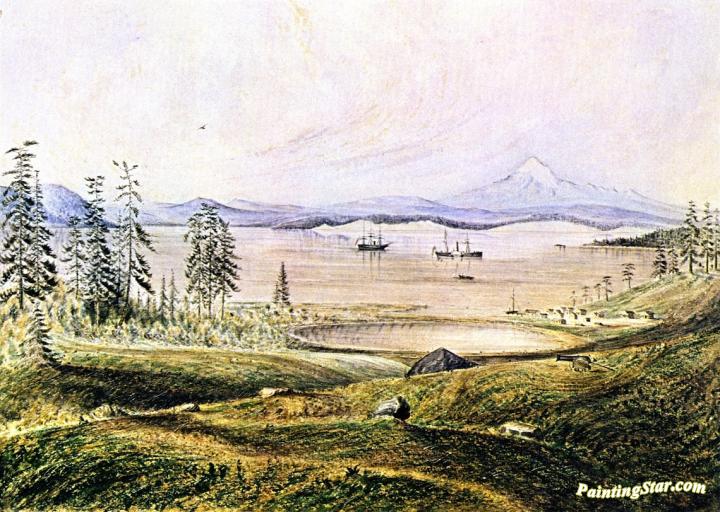 View from Hill on San Juan Island Looking South with Ontario Roads, Active and Ewing at Anchor, Lopez Island and Mount Baker in , Art Painting by James Madison Alden
