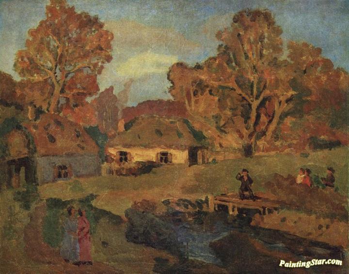 Village Landscape with Bridge, Art Painting by Nikolai Krymov