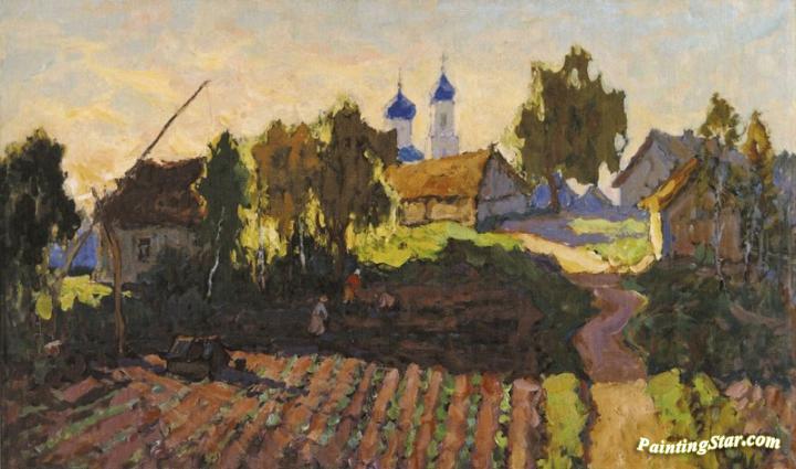 Village Landscape with Field and Church, Art Painting by Konstantin Gorbatov