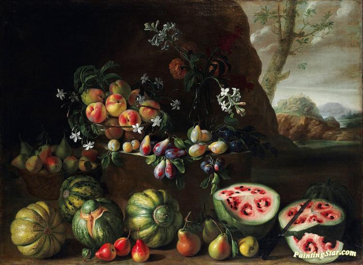 Watermelons, Peaches, Pears And Other Fruit In A Landscape, Art Painting by Giovanni Stanchi Dei Fiori