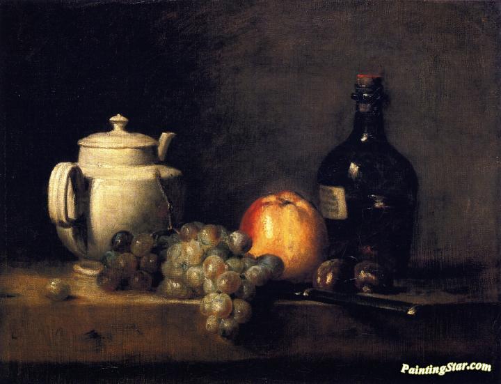 White Teapot with White and Red Grapes, Apple, Chestnuts, Knife and Bottle, Art Painting by Jean-Baptiste-Simeon Chardin