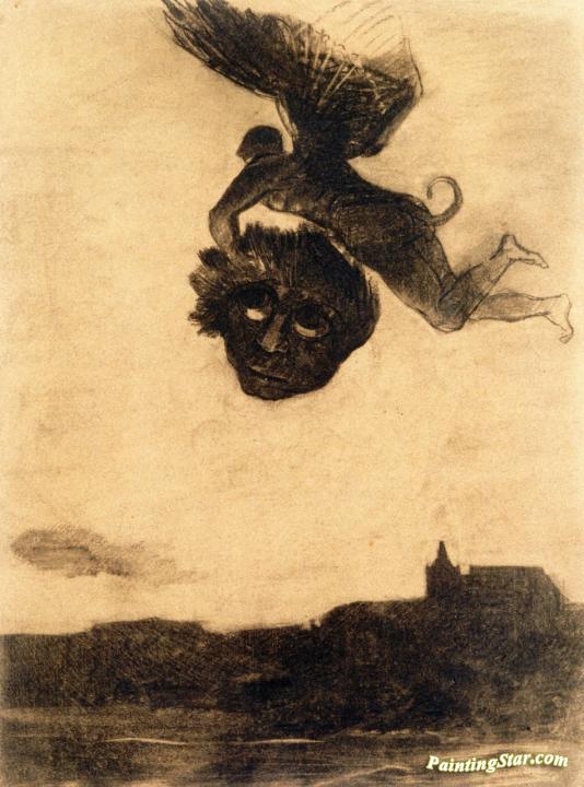 Winged Demon In The Air, Holding A Mask, Art Painting by Odilon Redon
