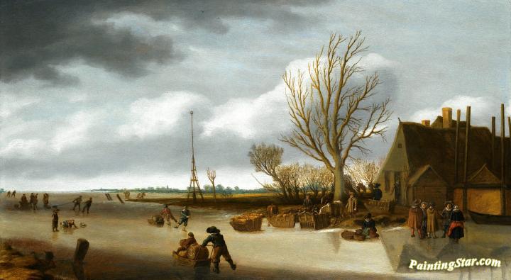 Winter Landscape with a Boy on skates pushing a Sled, Art Painting by Salomon van Ruysdael