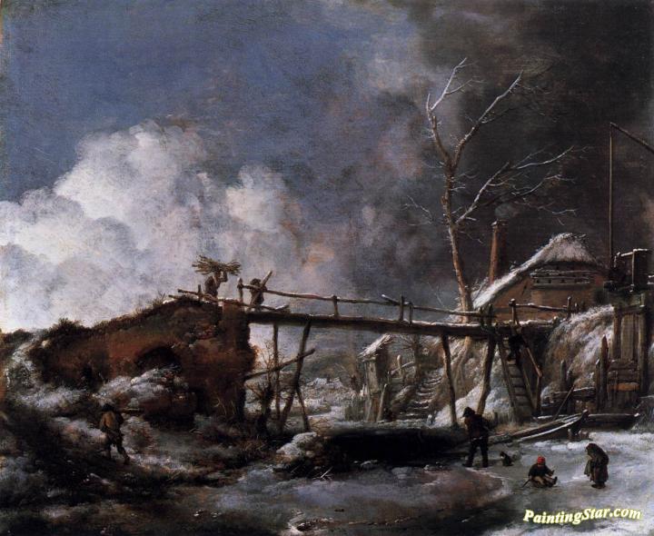 Winter Landscape with Wooden Bridge, Art Painting by Philips Wouwermans