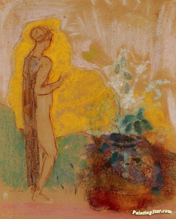 Woman and Stone Pot Full of Flowers, Art Painting by Odilon Redon