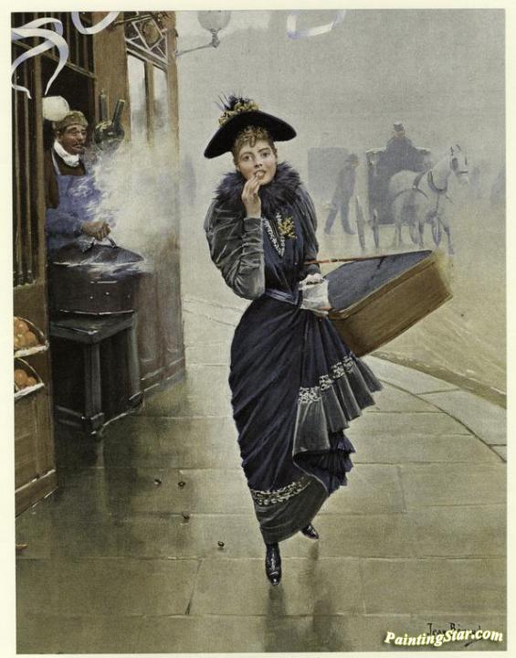 Woman Eating Roasted Nuts Walking Down a City Street, France, Art Painting by Jean Georges Beraud