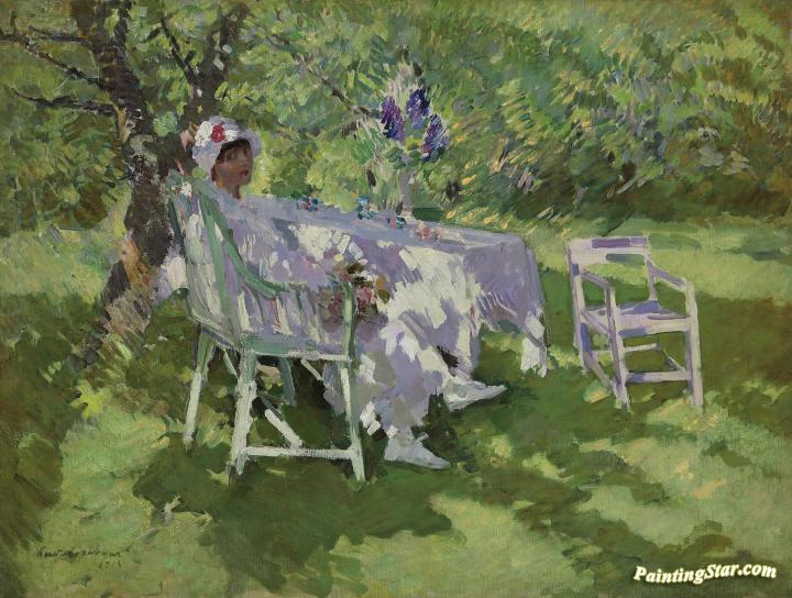 Woman In White Sitting In The Garden, Art Painting by Constantin Alexeevich Korovin
