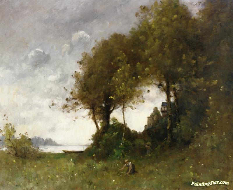 Woman Picking Flowers By The Water, Art Painting by Paul-Desire Trouillebert