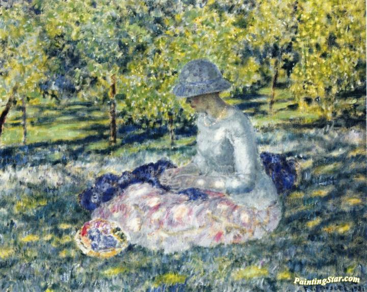 Woman Seated in a Park with Basket, Art Painting by Frederick Carl Frieseke