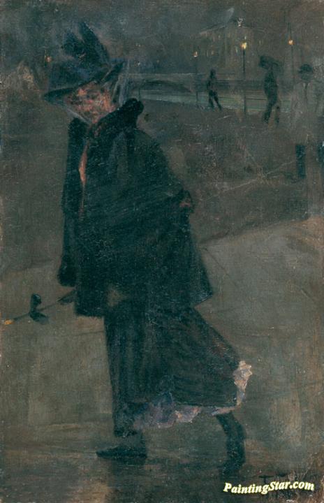 Woman walking with umbrella in nocturnal Berlin, Art Painting by Franz Skarbina
