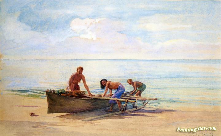 Women Drawing up a Canoe, Vaiala in Samoa, Otaota, Her Mother and a Neighbor, Art Painting by John La Farge