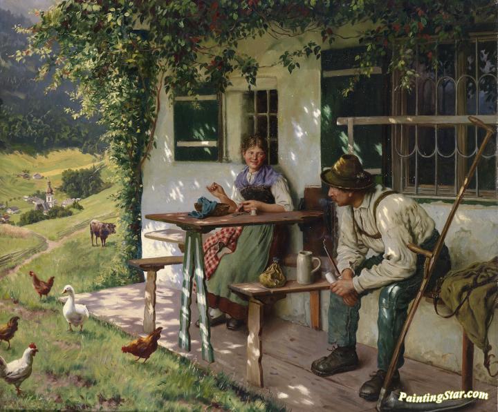 Young Couple In Front Of A Farmhouse In Upper Bavaria, Art Painting by Emil Rau
