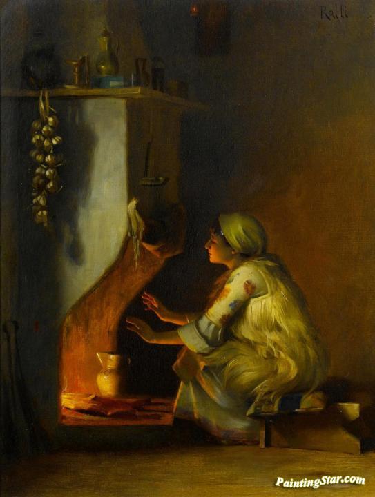Young girl by a fire, Art Painting by Theodoros Ralli