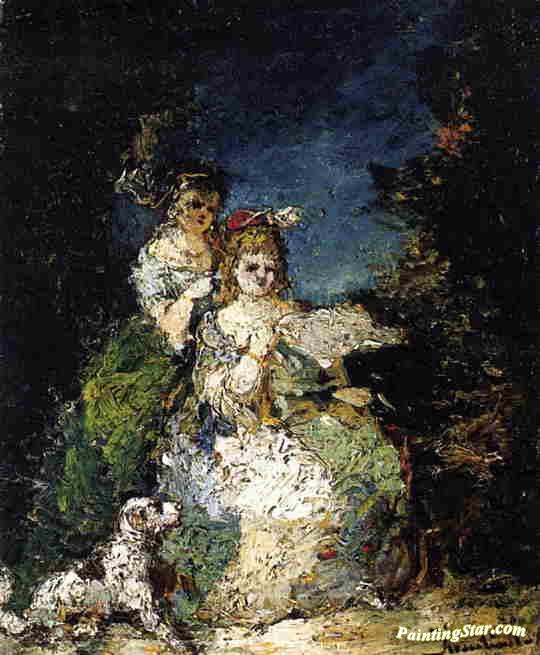 Young Girls And Dog In A Park, Art Painting by Adolphe Joseph Thomas Monticelli