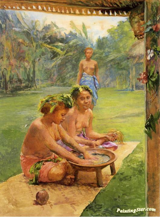Young Girls Preparing Kava. Outside of the Hut Whose Posts Are Decorated wih Flowers; the Attendant, Standing in the Background, Art Painting by John La Farge