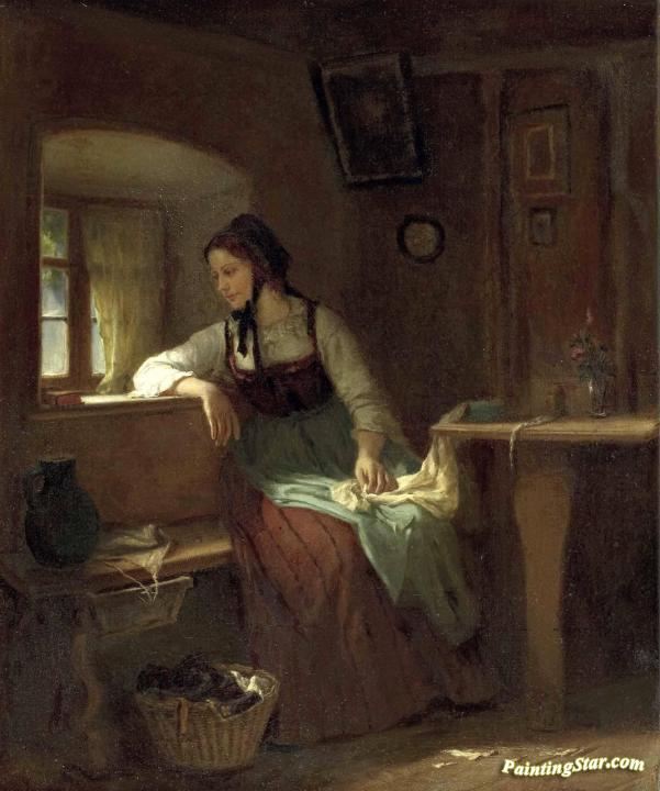 Young Peasant Girl at the Window, Art Painting by Ludwig Vollmar