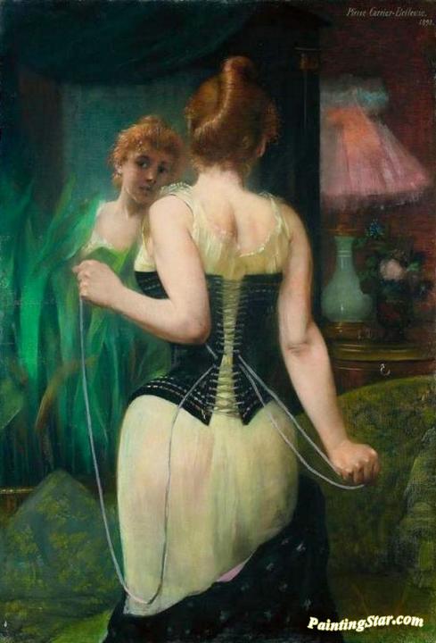 Young Woman Adjusting Her Corset Before Mirror, Art Painting by Pierre Carrier-Belleuse