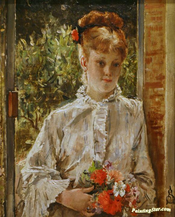 Young Woman in White Holding a Bouquet, Art Painting by Alfred Stevens