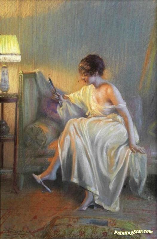 Young Woman On The Sofa With A Hand Mirror, Art Painting by Delphin Enjolras