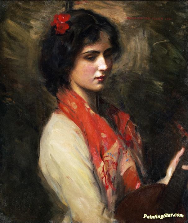 Young Woman With Mandolin, Art Painting by Harrington Mann