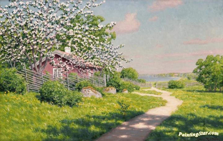 Cabin with blooming fruit trees, Art Painting by Johan Krouthén