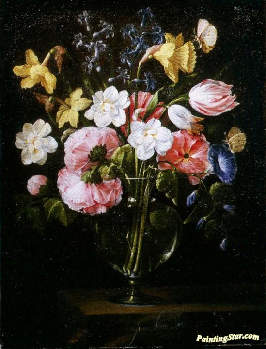 Roses, Clematis, a Tulip and other flowers in a Glass Vase on a wooden Ledge with a Butterfly, Art Painting by Juan de Arellano