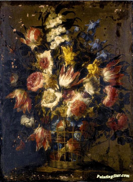 Still Life of Flowers in a Wicker Basket, Art Painting by Juan de Arellano