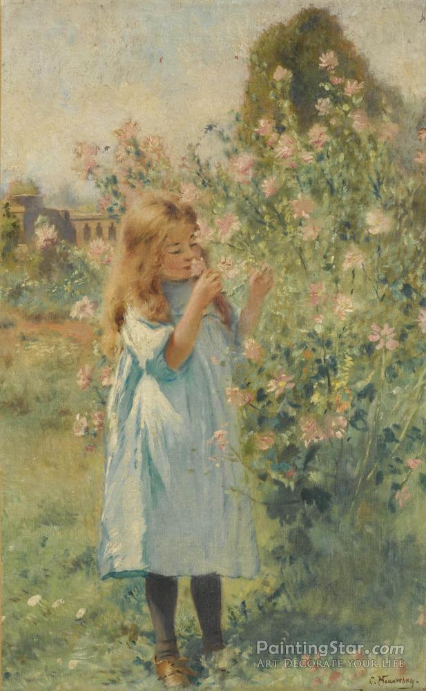 A Little Girl Smelling Mallow And Yarrow, Art Painting by Konstantin Egorovich Makovsky
