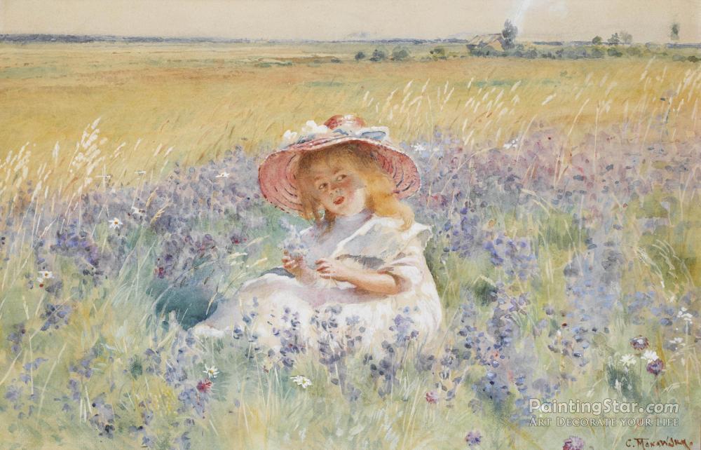 A Young Girl In A Field Of Salvia, Oxeye Daisies And Meadow Foxtail, Art Painting by Konstantin Egorovich Makovsky