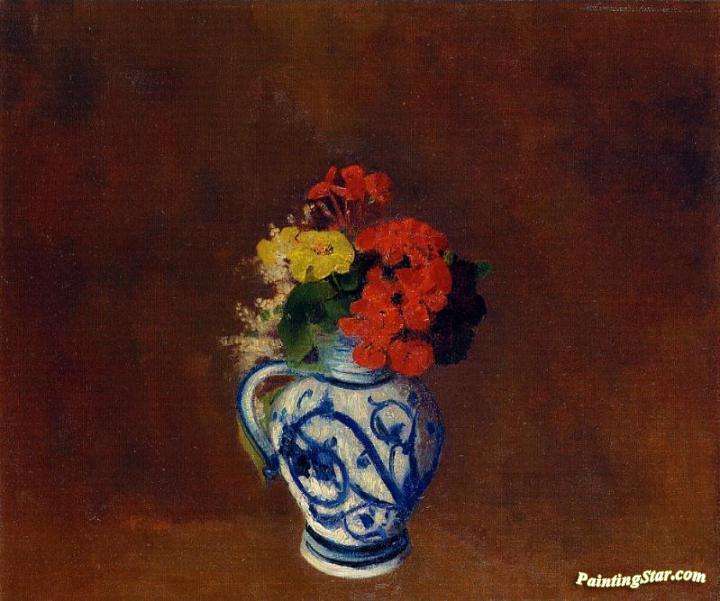 Flowers In A Vase With Blue Decoration, Art Painting by Odilon Redon