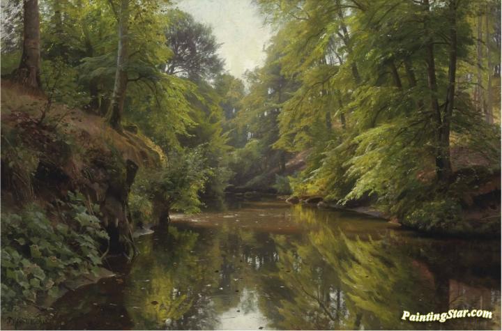 Wooded River Landscape, Art Painting by Peder Mork Monsted