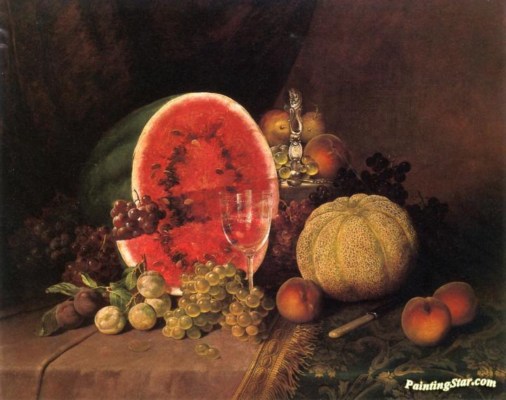 Still Life with Watermelon, Grapes, Peaches, Plums and Cantaloupe, Art Painting by William Mason Brown
