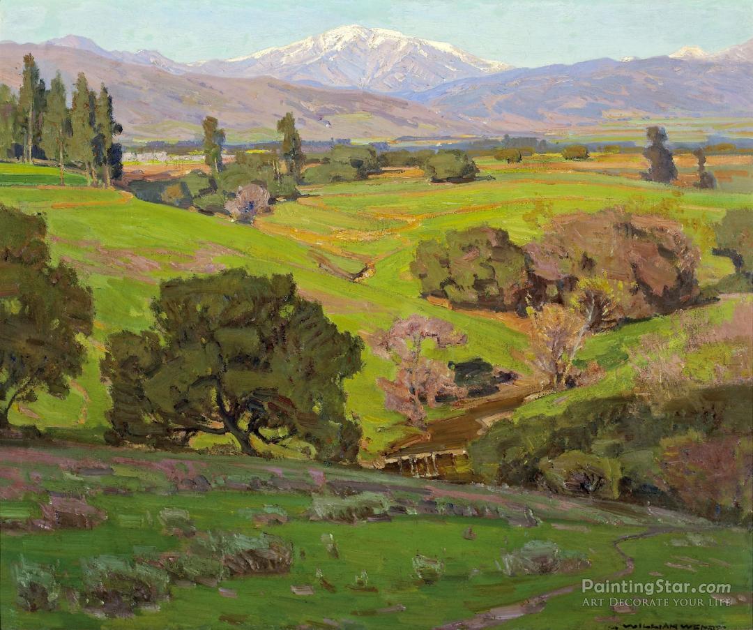 Rolling Hills With A Snow-capped Mountains Beyond, Art Painting by William Wendt